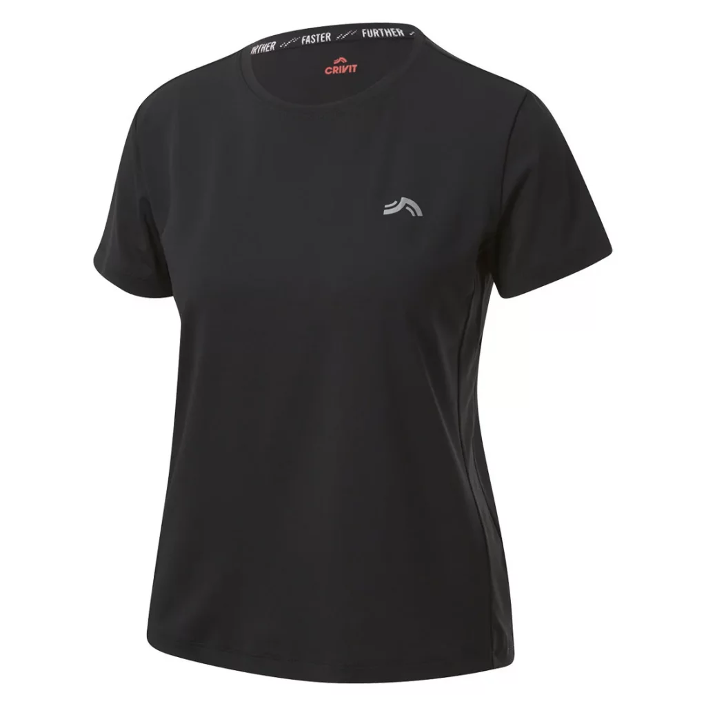 تی شرت ورزشی زنانه مشکی از برند CRIVIT آلمانی، مناسب برای رانینگ و کلیه ی فعالیت های ورزشی است.دارای علائم بازتابنده ی نور برای دید بهتر در شب است.دارای پارچه ی لطیف، سبک و نرم است.دارای قابلیت خشک و خنک نگه داشتن بدن در زمان انجام فعالیت است. بخاطر وجود LYCRA محصول بعداز شستشو و استفاده ظاهر خود را از دست نمی دهد. به سرعت رطوبت را جذب و دفع می کند.